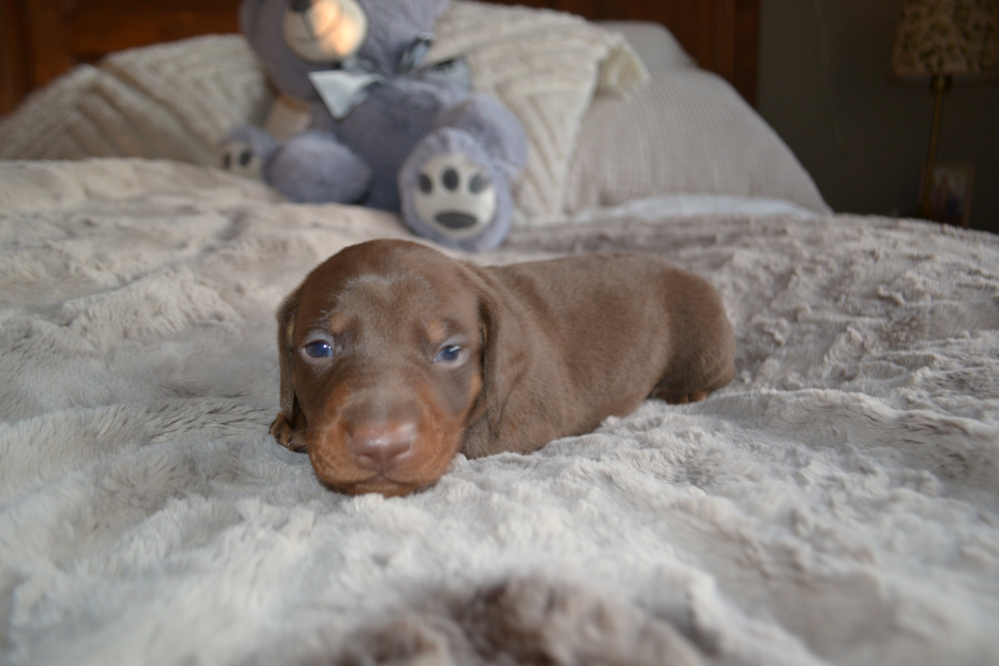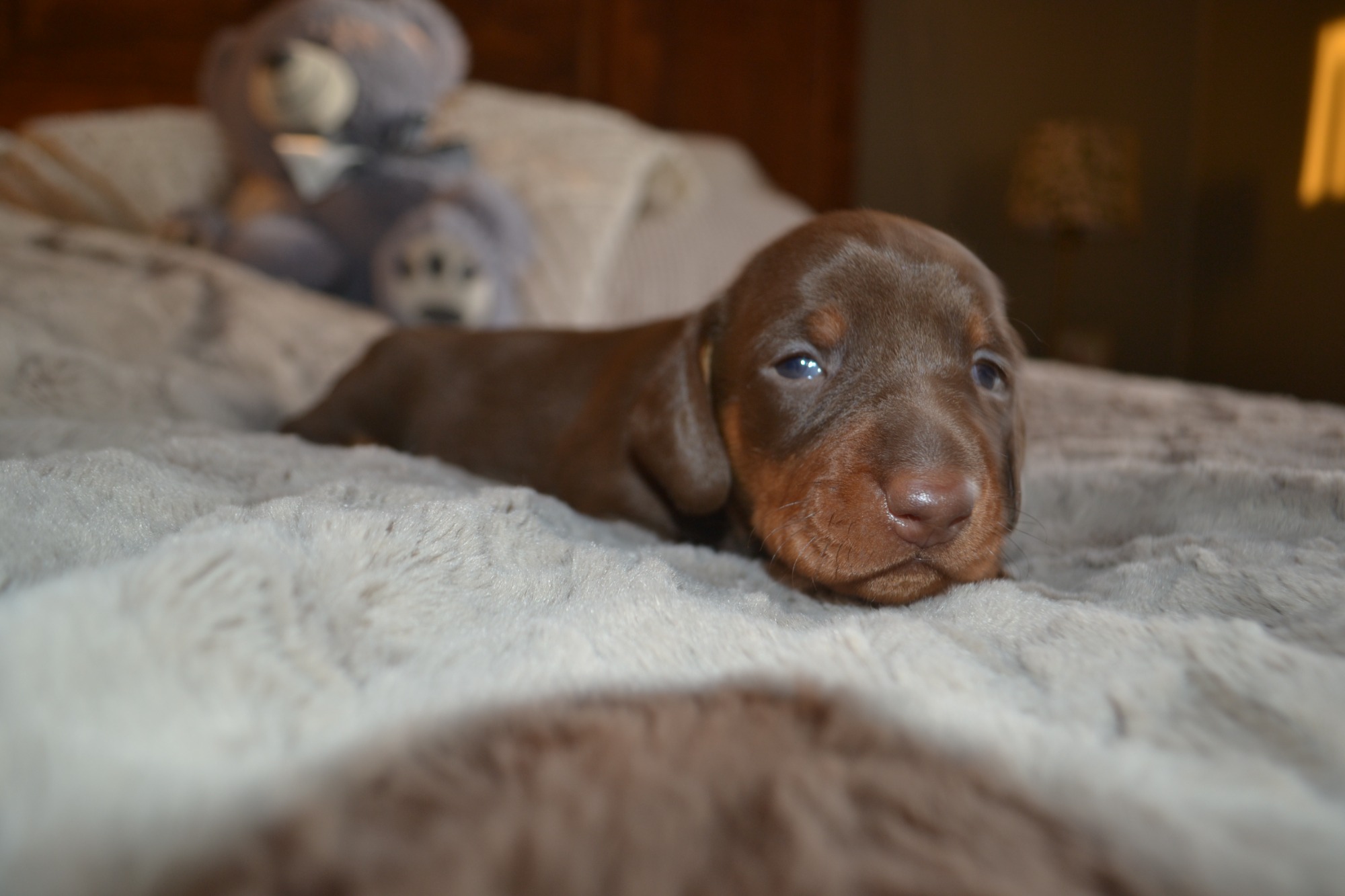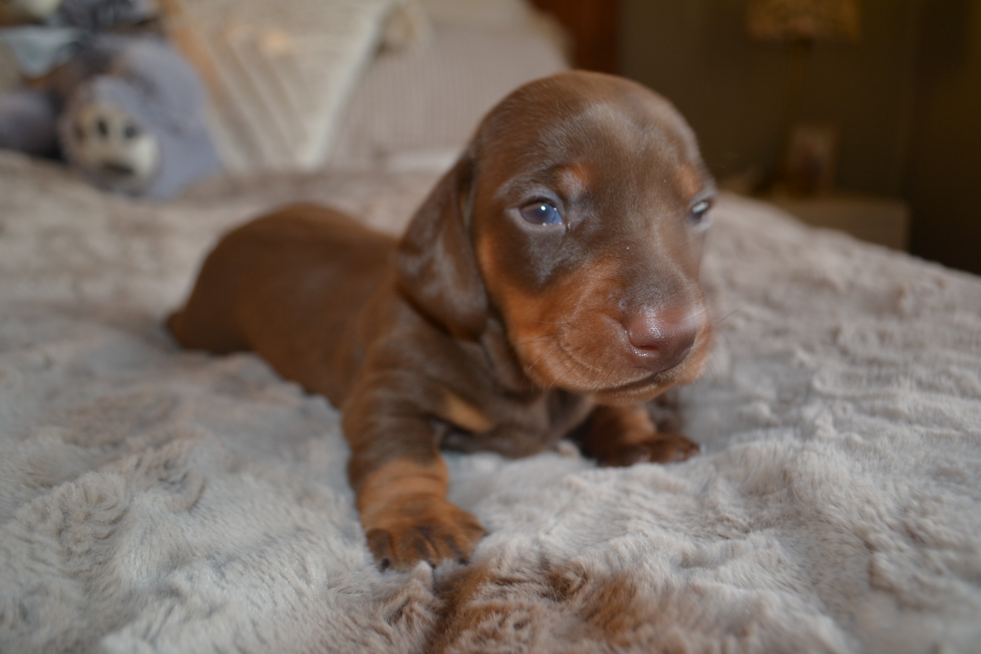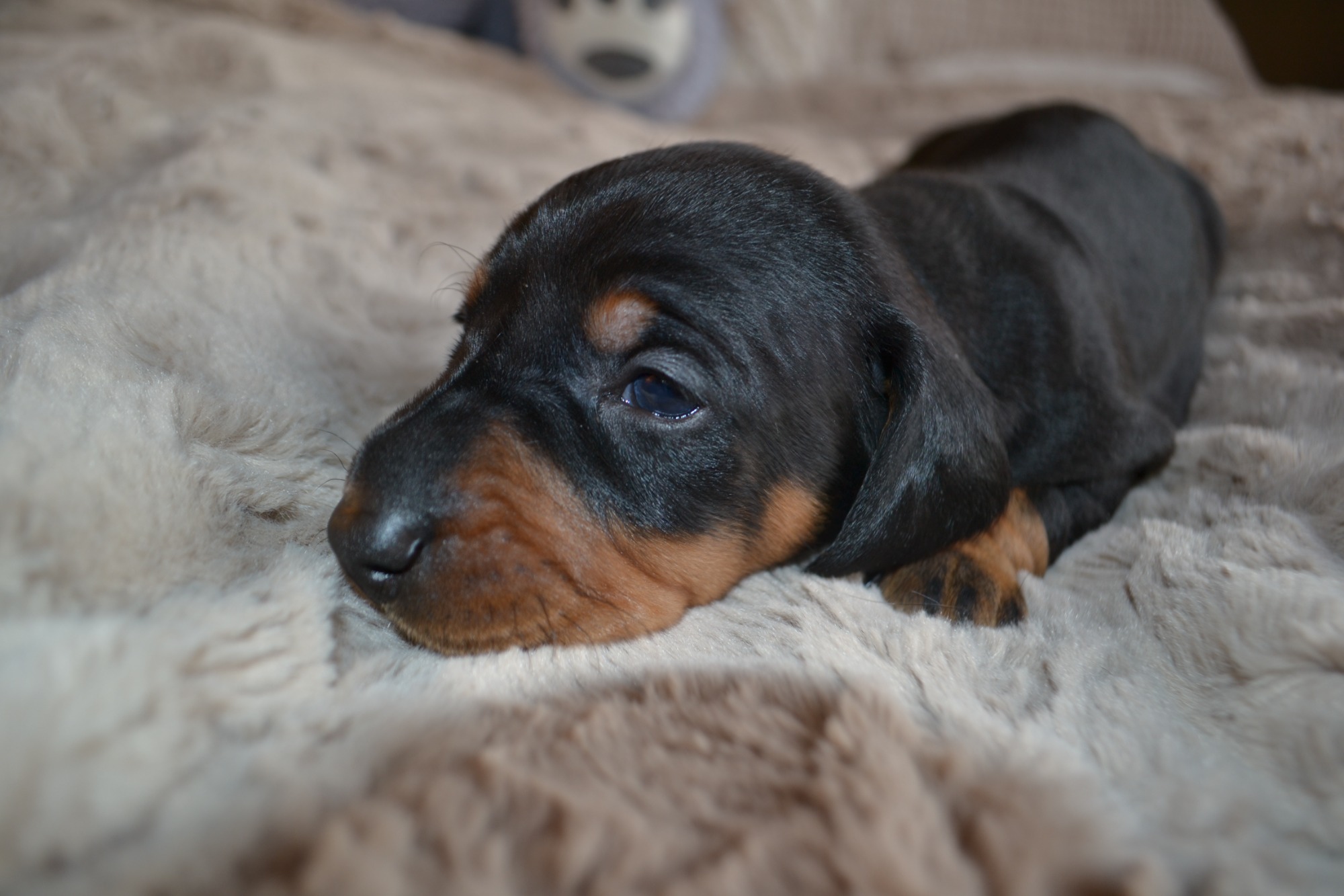 En tik brun med tan, två hanar brun med tan och en hane svart med tan.
